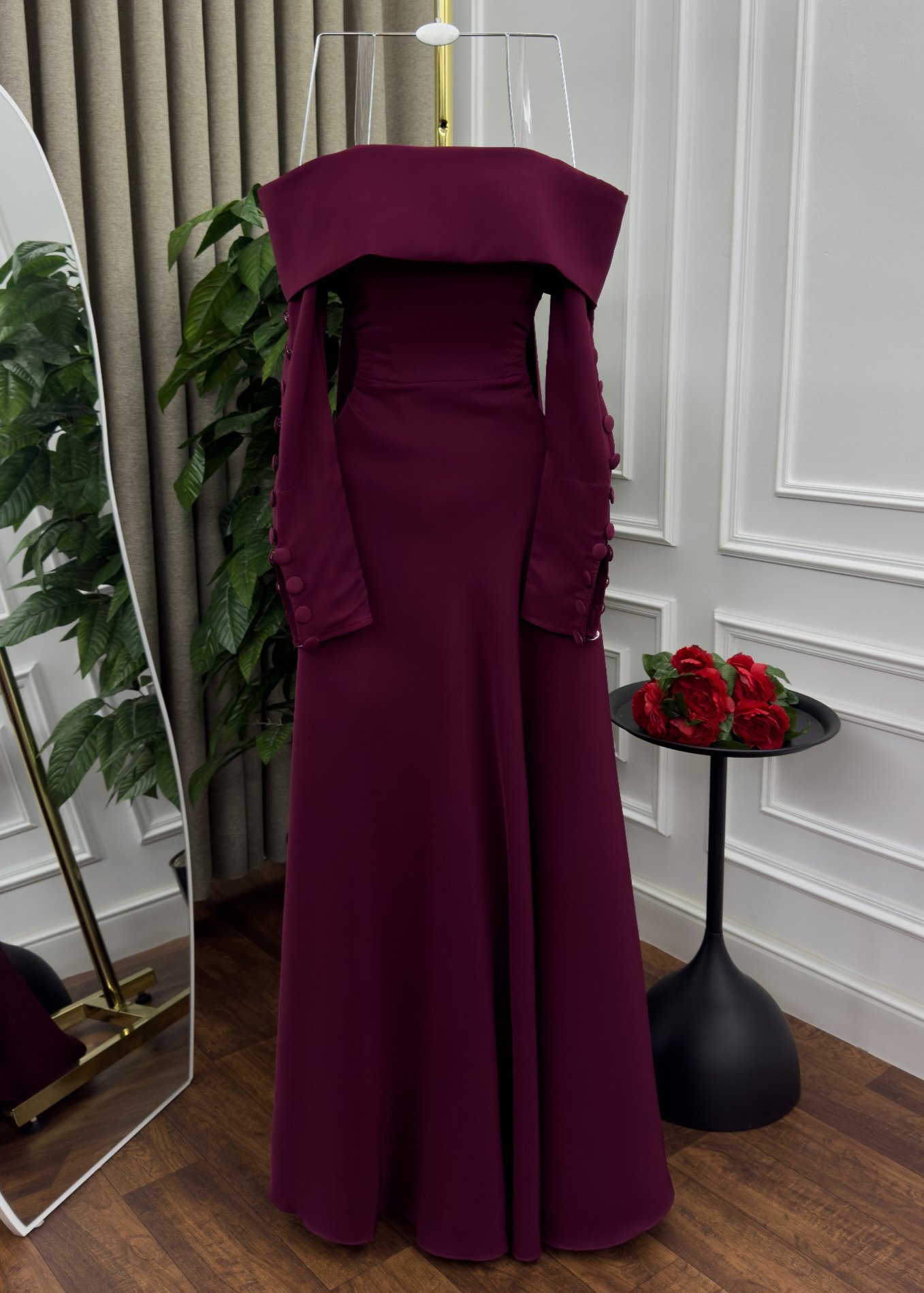 هذا الفستان الأنيق يتميز بتصميمه الفخم والراقي بلون عنابي